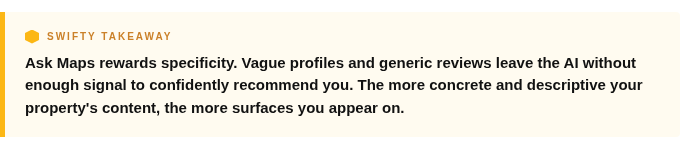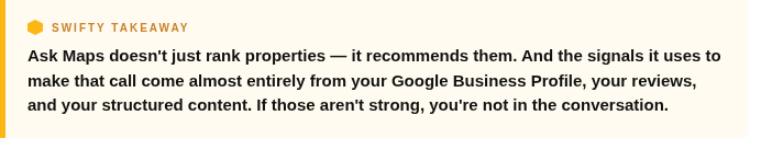 So when a renter asks “quiet apartment community with a pool near the medical district,” Ask Maps isn’t looking for properties that wrote those exact words in a title tag. It’s reading the full signal picture your property sends — your Google Business Profile, your reviews, your structured content — and making a judgment call about whether you’re a match.
