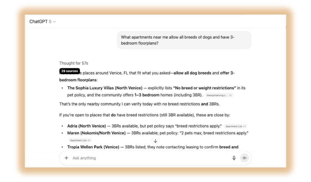 Renters are now asking conversational questions within generative AI platforms/tools like ChatGPT, Gemini, and Perplexity are changing how information is discovered. They don’t crawl and supply links in the same way Google does — they synthesize answers from multiple high-quality sources.